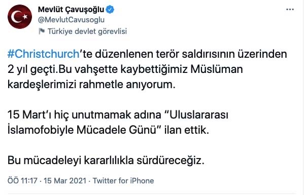 Dışişleri Bakanlığı, 15 Mart 2019 tarihinde Yeni Zelanda'nın Christchurch şehrinde bir camide 2 yıl önce gerçekleştirilen ve 1'i Türk 51 kişinin hayatını kaybettiği saldırısının ikinci yıl dönümü vesilesiyle bir mesaj yayımladı. Yapılan yazılı açıklamada, "Bu amaçla ülkemizin girişimleriyle İİT bünyesinde Avrupa Müslümanları Temas Grubu oluşturulmuştur. Yeni Zelanda'daki terör saldırısının hemen akabinde ülkemizin o tarihte İİT Zirve Dönem Başkanı sıfatıyla yapmış olduğu çağrı üzerine 22 Mart 2019 tarihinde İstanbul'da Dışişleri Bakanları Düzeyinde İİT Acil İcra Komitesi Toplantısı düzenlenmiş, o vesileyle İslam karşıtlığıyla mücadele konusunda uluslararası farkındalığın artırılması yönünde çağrıda bulunulmuştur. Bu anlayış çerçevesinde, 27-28 Kasım 2020 tarihlerinde Niamey'de toplanan İİT 47'nci Dışişleri Bakanları Konseyi tarafından 15 Mart tarihinin 'İslamofobiyle Mücadele Uluslararası Günü' ilan edilmesi yönünde bir karar alınmıştır. Sözkonusu karar uyarınca, İslam karşıtlığıyla mücadele konusunda uluslararası farkındalık yaratılması bağlamında İİT üyesi ülkelerin BM nezdindeki Daimi Temsilciliklerinin girişimleriyle 17 Mart 2021 tarihinde düzenlenecek yüksek düzeyli çevrimiçi etkinliğe Sayın Bakanımız da bir video mesajıyla katılacaktır. İslam karşıtlığıyla mücadele konusunun BM başta olmak üzere uluslararası ve bölgesel kuruluşların gündeminde tutulmasına yönelik aktif çaba ve girişimlerimiz sürecektir. Ayrıca, Bakanlığımız tarafından başlatılan çalışma çerçevesinde, İslam düşmanlığı, yabancı düşmanlığı, ırkçılık içeren eylem ve söylemlerin olduğu ülkelerle ilgili yıllık raporlar hazırlanıp, uluslararası kamuoyuyla paylaşılacaktır" ifadeleri yer aldı.