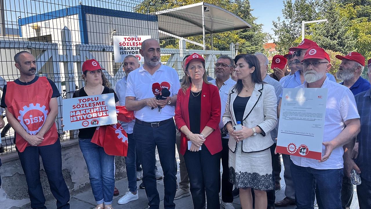 Çalışma ve Sosyal Güvenlik Bakanlığı önünde yapılan açıklamada konuşan DİSK Genel Başkanı Arzu Çerkezoğlu, "Bilindiği üzere sendikamız Temmuz 2024 İstatistiklerine belli konularda itiraz etmiş ve bu itirazını yargıya da taşımıştır. Ankara 4. İş Mahkemesi'ne istatistiklere itiraz davamız, Anayasa Mahkemesi'ne 'hak ihlali gerekçesiyle bireysel başvurumuz davam etmektedir. 10 bin sağlık ve sosyal hizmet işçisi olarak toplu sözleşme hakkımız elimizden alınmaya çalışılmaktadır. 24 Temmuz 2024 tarihinde yayımlanan Resmi Gazetede sendikamızın işkolu barajı 0,99, sendikamızın üye sayısı 7 bin 400, işkolunda çalışan işçi sayısı ise daha önce istatistiklerde görülmeyen 4B'li memurlar ve üniversite hastanelerinde çalışan İntern hekimlerle 750 bin 259 olarak açıklanmıştır" diye konuştu.