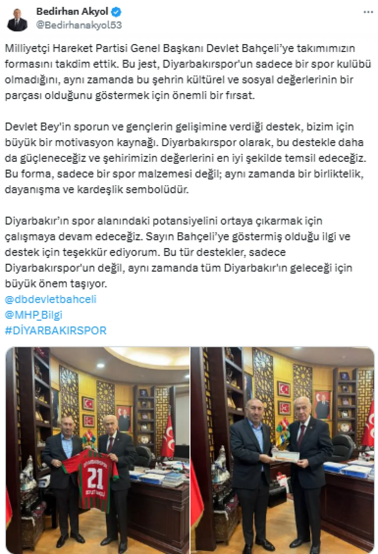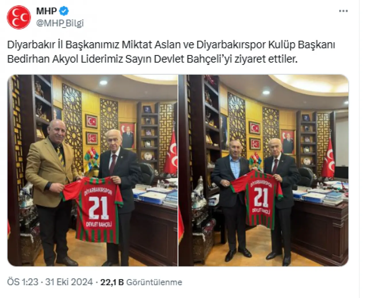 Paylaşımda, MHP Diyarbakır İl Başkanı Miktat Aslan ve Diyarbakırspor Kulüp Başkanı Bedirhan Akyol'un Bahçeli'yi ziyaret ettiği belirtildi.