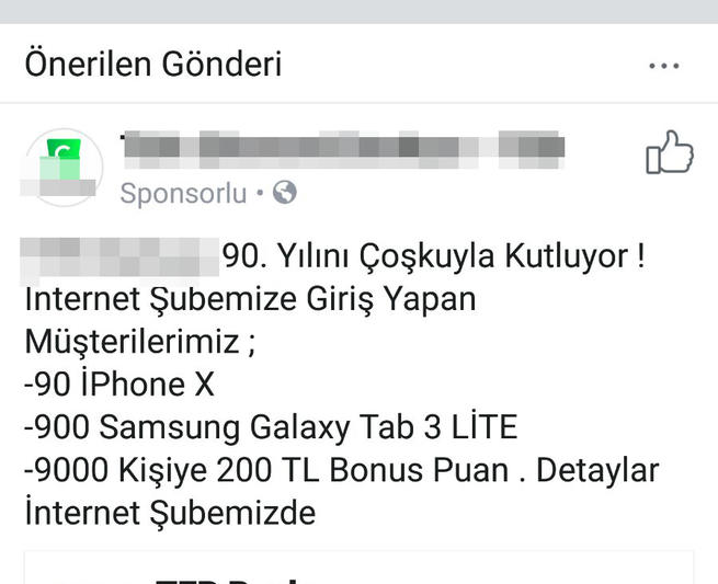 Milyonlarca banka müşterisi, dolandırıcıların sosyal medya sitelerinde kurdukları tuzağa düşüyor. Dün gece Facebook’a girenler ilginç bir durum ile karşılaştı. Dolandırıcılar, özel bir bankaya ait sayfa görüntüsü oluşturdu. Tüketicileri, çeşitli vaatler sunarak, oluşturdukları linke yönlendiren dolandırıcılar böylece siteye giriş yapan kişilerin hesap bilgilerini ele geçirdi.