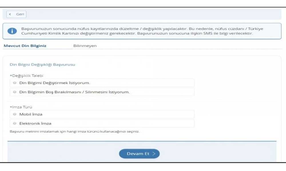 Vatandaşlar e-Devlet üzerinden inanç bilgilerini değiştirebilecekler. Daha önceleri İl Nüfus Müdürlükleri tarafından yapılan bu işlem, artık online olarak gerçekleştirilebiliyor.