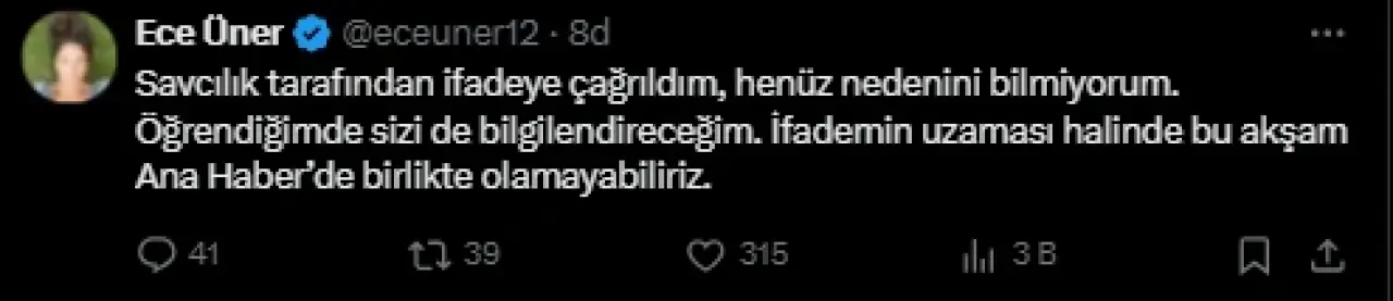 "Savcılık tarafından ifadeye çağrıldım, henüz nedenini bilmiyorum. Öğrendiğimde sizi de bilgilendireceğim. Eğer ifadem uzun sürerse bu akşam Ana Haber’de birlikte olamayabiliriz."