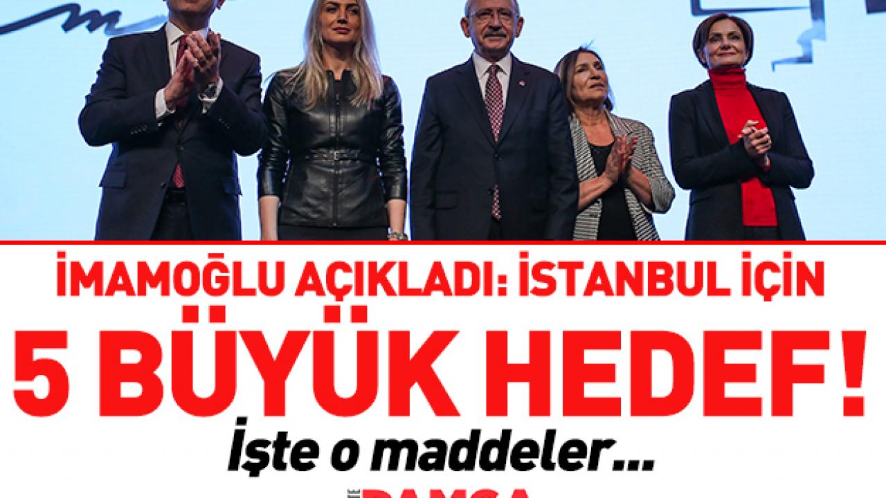 İstanbul’la ilgili 5 büyük hedefini de açıklayan İmamoğlu, hedeflerini, "İstanbul’un ulaşım ve trafik sorununu çözmek. İstanbul’daki kent yoksulluğu ile mücadele etmek ve pahalı yaşamı ucuzlatmak. İstanbul'da doğru kentsel planlama ile çevre, imar ve deprem sorunlarını çözmek. İstanbul'un işsizlik sorununu çözmek, yeni ekonomi ve yaratıcı endüstriler için İstanbul'u bir çekim merkezine dönüstürmek. İstanbul'un yaşam kalitesini yükseltmek, kültür, sanat ve spor faaliyetlerini, İstanbul'un tamamına yaymak" şeklinde sıraladı. İmamoğlu bu hedeflere nasıl ulaşacağını da, "Her şeyden önce bir Kent Anayasası'yla… Toplumsal uzlaşmayla yazacağımız yeni bir mutabakat belgesiyle. Kente özen ve insana saygıyla. Demokratik katılım ve ortak akılla. Sürdürülebilirlik ve inovasyonla. Yasam kalitesi önceligi ile" gerçekleştireceğini söyledi.