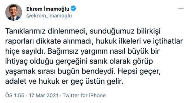 İmamoğlu Twitter hesabından yaptığı açıklamada, “Tanıklarımız dinlenmedi, sunduğumuz bilirkişi raporları dikkate alınmadı, hukuk ilkeleri ve içtihatlar hiçe sayıldı. Bağımsız yargının nasıl büyük bir ihtiyaç olduğu gerçeğini sanık olarak görüp yaşamak sırası bugün bendeydi. Hepsi geçer, adalet ve hukuk er geç üstün gelir.” ifadesini kullandı.