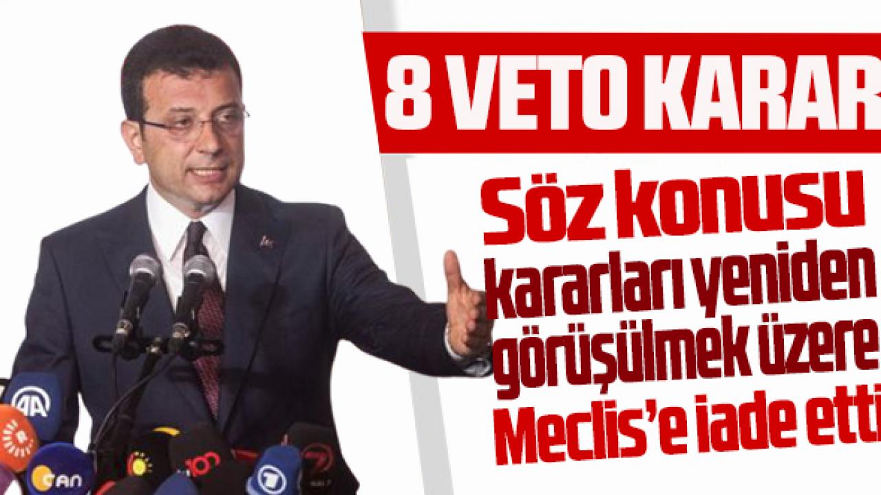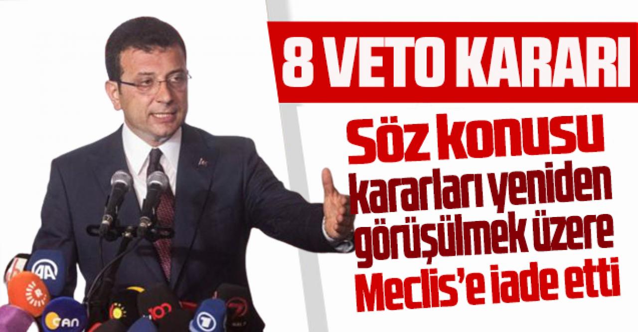 İstanbul Büyükşehir Belediye (İBB) Başkanı Ekrem İmamoğlu, çoğunluğun AK Parti Grubu'nda olduğu İBB Meclisi’nin, İBB'ye ait bazı taşınmazların AKP'li ilçe belediyelerine tahsisine ilişkin kararların arasında bulunduğu 8 kararını veto etti. İmamoğlu, söz konusu kararları yeniden görüşülmek üzere Meclis’e iade etti.