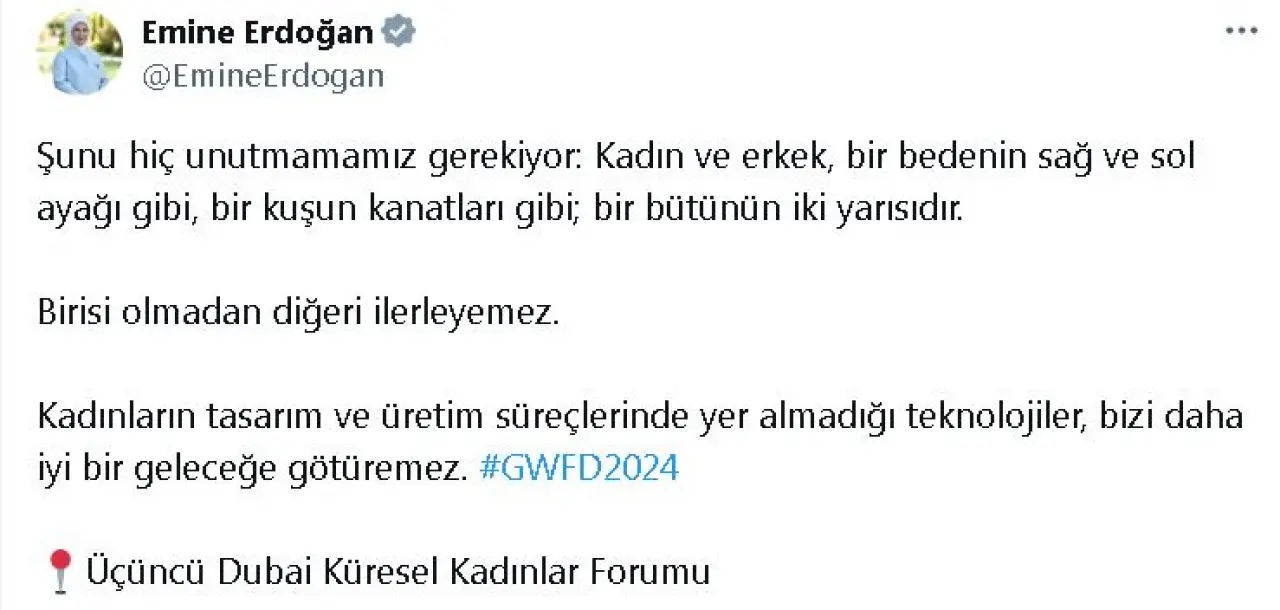 Emine Erdoğan, sosyal medya hesabı üzerinden yaptığı paylaşımda, "Şunu hiç unutmamamız gerekiyor, kadın ve erkek, bir bedenin sağ ve sol ayağı gibi, bir kuşun kanatları gibi, bir bütünün iki yarısıdır. Birisi olmadan diğeri ilerleyemez. Kadınların tasarım ve üretim süreçlerinde yer almadığı teknolojiler, bizi daha iyi bir geleceğe götüremez" şeklinde konuştu.