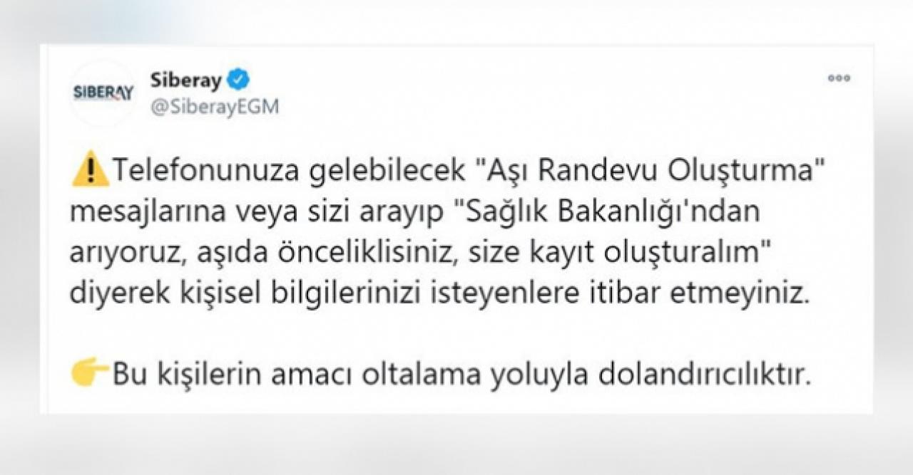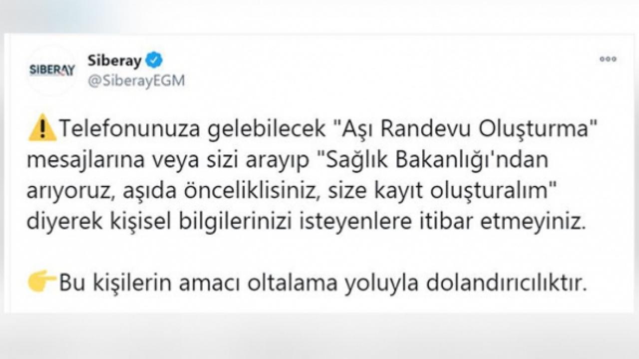 Siber Suçlarla Mücadele Daire Başkanlığı'nın Twitter hesabından yapılan açıklamada, "Telefonunuza gelebilecek 'Aşı Randevu Oluşturma' mesajlarına veya sizi arayıp 'Sağlık Bakanlığı'ndan arıyoruz, aşıda önceliklisiniz, size kayıt oluşturalım' diyerek kişisel bilgilerinizi isteyenlere itibar etmeyiniz. Bu kişilerin amacı oltalama yoluyla dolandırıcılıktır" ifadelerine yer verildi.