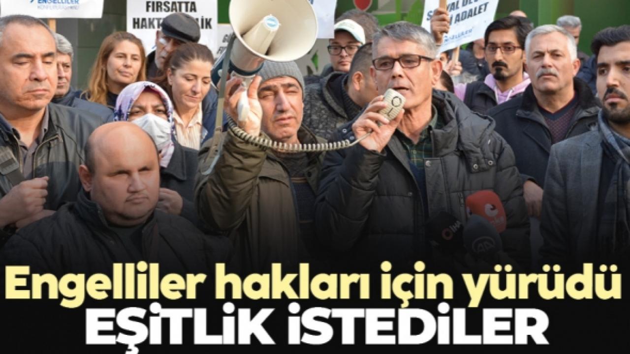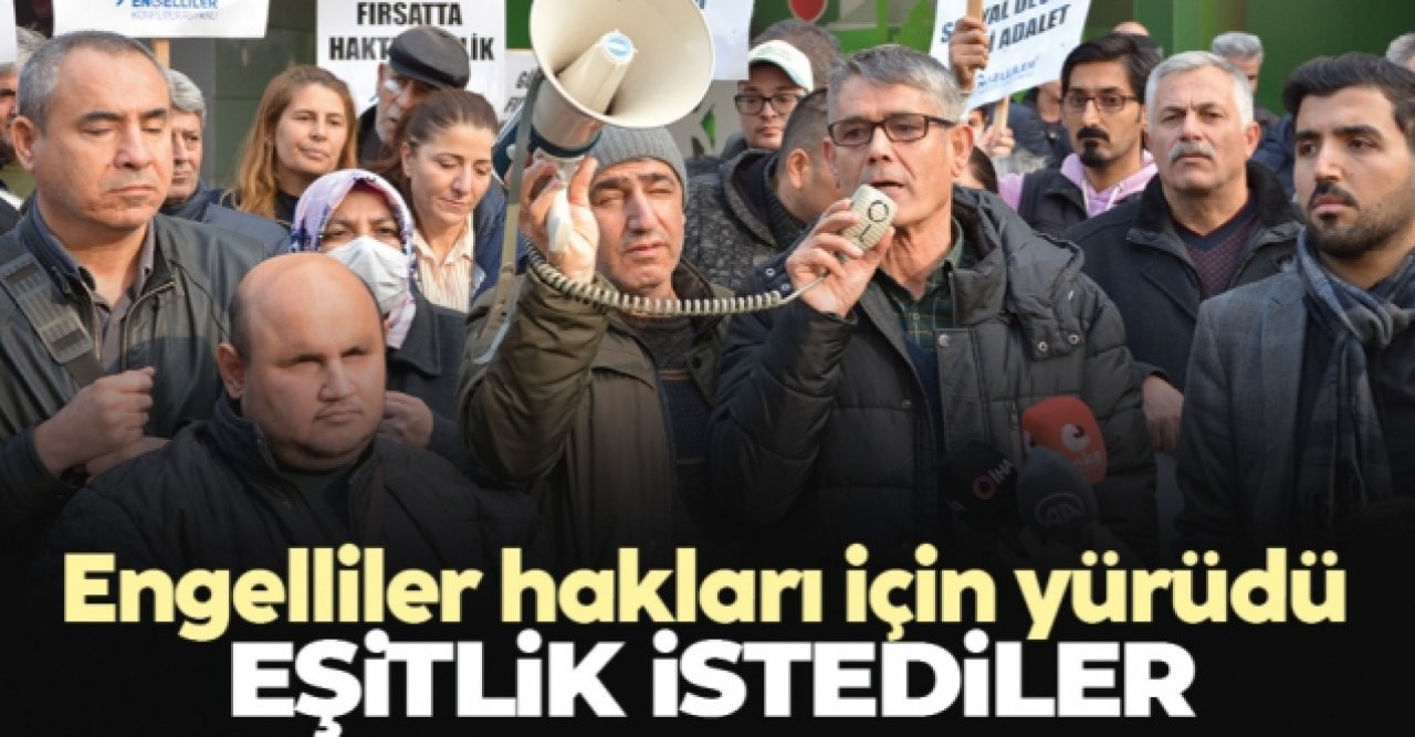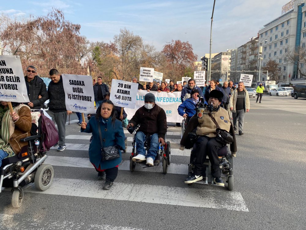 Ankara'da Engelliler Konfederasyonu'nun öncülüğünde bir araya gelen engelliler yürüyüş yaptı. Engelli örgütleri engellilerle ilgili görüşlerini, niyetlerini, dileklerini, sorunları dile getirdi. Yürüyüşün ardından konuşan Konfederasyon Başkanı Mustafa Özsaygı, “31 Aralık 2021 tarihli TÜİK rakamlarına göre Türkiye’de 3 milyon 337 bin 922 kadın ve 2 milyon 503 bin 258 erkek olmak üzere 5 milyon 841 bin 180 engelli kişi yaşamaktadır. Buna karşın çalışan engelli sayısı Temmuz 2022 verilerine göre özel ve kamuda çalışanlar olarak 140 bin 632 işçi, 65 bin 662 memur olmak üzere 206 bin 294 kişidir. 729 bin 821 engelli birey de engelli aylığı almaktadır. Çalışan ve engelli aylığı alan engellilerin toplamı 936 bin165 kişidir. Resmi verilere göre bile 4 milyon 905 bin 15 engelli birey hiçbir temel yaşamsal hakka sahip değildir. Türkiye’de iş gücüne katılım oranı yüzde 53 iken engellilerin katılım oranı yüzde 22,1’dir. Bu oran kadın engellilerde yüzde 12 buçuk düzeyindedir” bilgisini verdi.