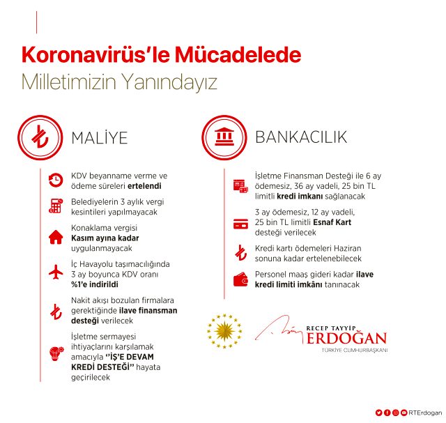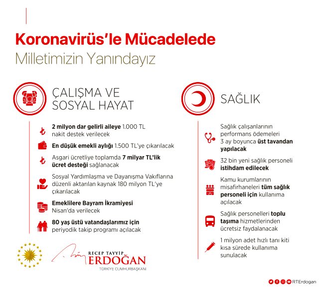 Erdoğan paylaşımında, "En düşük emekli aylığı 1500 liraya çıkarılacak, 2 milyon dar gelirli aileye 1000 Türk Lirası nakit destek verilecek, Asgari ücretliye toplamda 7 milyar liralık ücret desteği sağlanacak, Sosyal Yardımlaşma ve Dayanışma Vakıfları'na düzenli aktarılan kaynak 180 milyon liraya çıkarılacak, 80 yaş üstü vatandaşlarımız için periyodik takip programı açılacak, Kamu kurumlarının misafirhaneleri tüm sağlık personeli için kullanıma açılacak, KOBİ'lerin KOSGEB ödemeleri 30 Haziran'a ertelenecek, Yerli dezenfektan, koruyucu elbise gözlük ve maske üreten firmalara 6 milyon TL destek verilecek, Nakit akışı bozulmadan firmalara gerektiğinde ilave finansman desteği verilecek, İşletme sermayesi ihtiyaçlarını karşılamak amacıyla 'işe devam kredi desteği' hayata geçirilecek, 3 ay ödemesiz, 12 ay vadeli 25 bin TL limitli 'esnaf kart' desteği verilecek" ifadelerini kullandı.