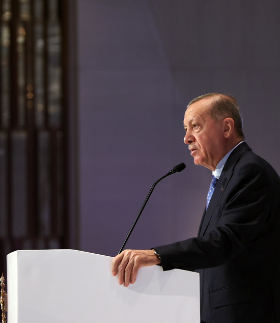 Diplomaside uygulanan dengeli, tarafsız ve barışçıl politikalarla krizlerin çözümünde anahtar rol üstlendiklerini vurgulayan Erdoğan, şöyle konuştu: "Esir takası ile tahıl koridorunun açılması ve devam ettirilmesindeki kritik rolümüz, ülkemizin diplomatik gücünü gösteren önemli birer örnektir. Biz bu süreç içerisinde Sayın Putin'le olan münasebetlerimiz, Sayın Zelenski ile olan münasebetlerimiz, Sayın Guterres'le olan münasebetlerimiz... Bunların hepsi dengeli bir şekilde yürümüş ve ne uzak, ne yakın bu dengeyi kurmak suretiyle de bu süreci işletme fırsatını bulduk. İnşallah 'Türkiye Yüzyılı' vizyonumuzla planlarımızı şimdiden yapacak, gelecek tasavvurumuzu bir adım daha öteye taşıyacağız." Erdoğan, insanların devletten talebinin artması sonucu, siyasetçiden ve siyaset kurumundan da beklentilerin yükseldiğini belirterek, iletişim ve ulaşım imkanlarının yaygınlaştığı günümüzde siyasetçinin yükünün daha önce hiç olmadığı kadar ağırlaştığını söyledi.