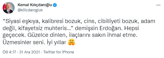 Cumhurbaşkanı ve AK Parti Genel Başkanı Erdoğan'ın kendisini hedef almasına yanıt veren CHP lideri Kılıçdaroğlu, "Hepsi geçecek. Güzelce dinlen, ilaçlarını sakın ihmal etme. Üzmesinler seni. İyi yıllar” mesajında bulundu.