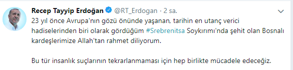 Srebrenista Soykırımı'nın, tarihin en utanç verici hadiselerinden birisi olduğunu vurgulayan Cumhurbaşkanı Erdoğan'ın yaptığı paylaşım şöyle;
