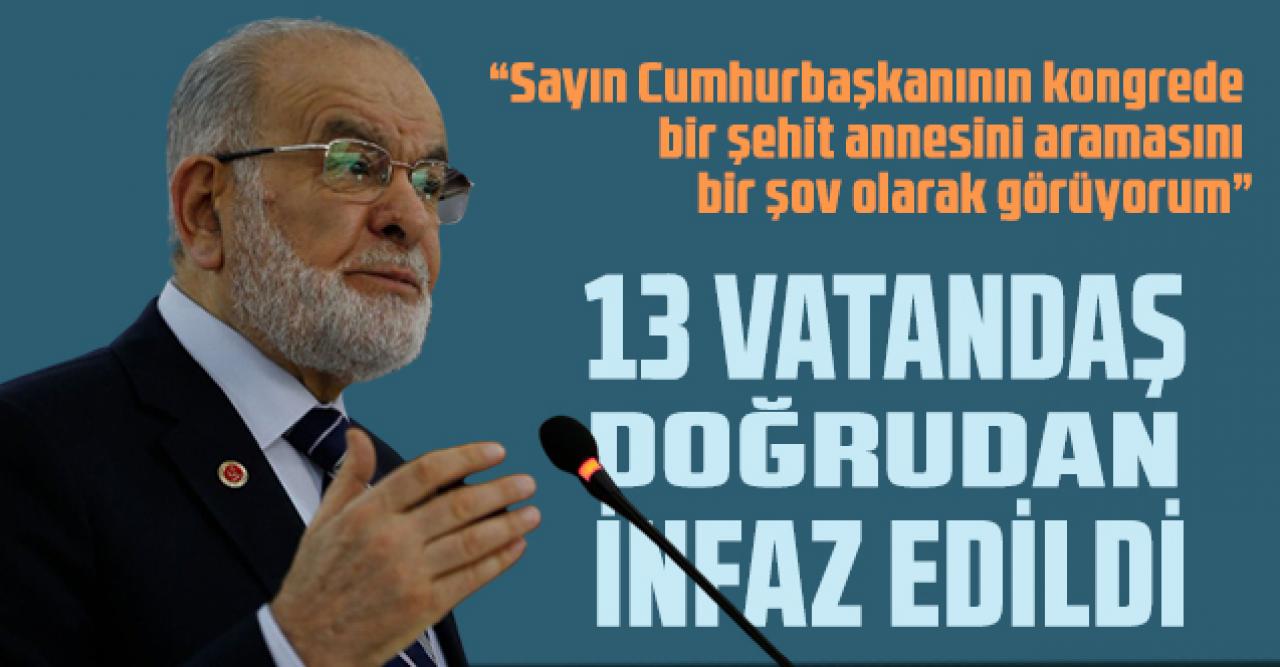 Üzülerek ifade ediyorum ki Sayın Cumhurbaşkanının kongrede bir şehit annesini aramasını bir şov olarak görüyorum. Yapmayın Allah aşkına. Bu o kadar sırıtıyor ki. Sanki başka zaman kalmadı bir kongrenin süresi içinde herkese 'bak biz şehitlerimizin ailelerine ne kadar yakınlık gösteriyoruz' gibi bir tavrı sergilemek ayıptır. Kabullenmek mümkün değil. Etrafında bir tane adam yok mu ki Sayın Cumhurbaşkanım bu yanlış demiyor. Hakikaten üzüntümüz çok büyük.13 vatandaşımız doğrudan infaz edildi.