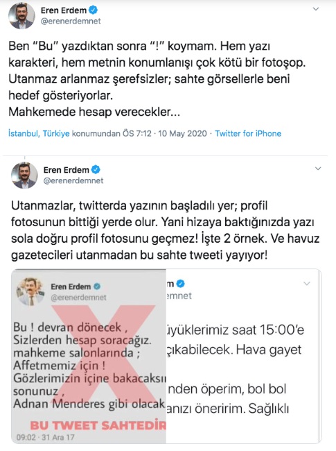 "Arkadaşlar, lütfen paylaşınız. Bu görsel dolaştırılıyor, bu SAHTEDİR! Sahte olduğu hususunda MAHKEME KARARI vardır. Hem yazı karakteri; hem görseldeki PROFİL RESMİ ile yazı arasındaki boşluk sahte olduğunu gösteriyor. Böyle bir tweet hiç atılmadı! Kötü bir fotoşop...Ben “Bu” yazdıktan sonra “!” koymam. Hem yazı karakteri, hem metnin konumlanışı çok kötü bir fotoşop. Utanmaz arlanmaz şerefsizler; sahte görsellerle beni hedef gösteriyorlar. Mahkemede hesap verecekler..."
