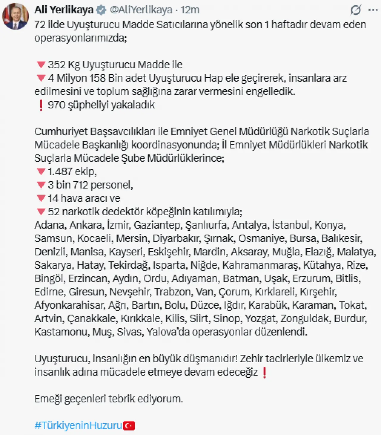 “Uyuşturucu insanlığın en büyük düşmanıdır! Zehir tacirleriyle ülkemiz ve insanlık adına mücadele etmeye devam edeceğiz.”