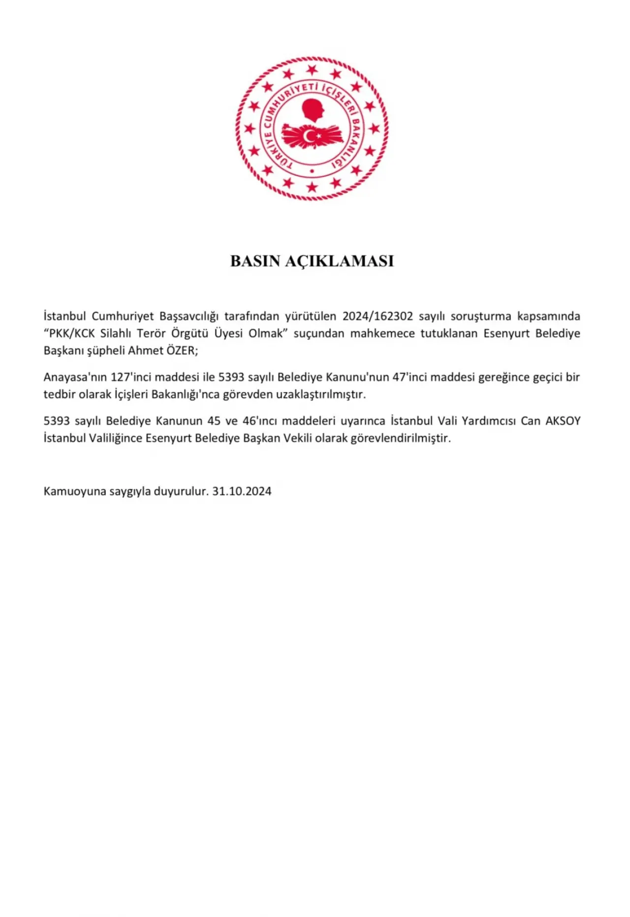 Bakanlığın resmi açıklamasında şu ifadelere yer verildi: “İstanbul Cumhuriyet Başsavcılığı tarafından yürütülen soruşturma kapsamında 'PKK/KCK silahlı terör örgütü üyesi olmak' suçundan mahkemece tutuklanan Esenyurt Belediye Başkanı şüpheli Ahmet Özer, Anayasa'nın 127'nci maddesi ile 5393 sayılı Belediye Kanunu'nun 47'nci maddesi gereğince geçici bir tedbir olarak İçişleri Bakanlığınca görevden uzaklaştırılmıştır. 5393 sayılı Belediye Kanunu'nun 45. ve 46'ncı maddeleri uyarınca İstanbul Vali Yardımcısı Can Aksoy'un, Belediye Başkan Vekili olarak görevlendirilmiştir."