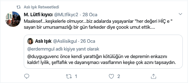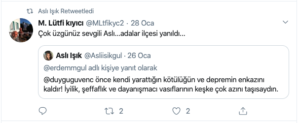 Aslı Gül'ün eşini suçladığı paylaşımını alıntılayan M. Lütfi Kıyıcı isimli kişi de "Maalesef...keşkelerle olmuyor...biz adalarda yaşayanlar "her değeri HİÇ e " sayan bir umursamazlığı bir gün farkeder diye çoook umut ettik...." dedi. Aslı Işık Gül de bu yorumu RT etti.