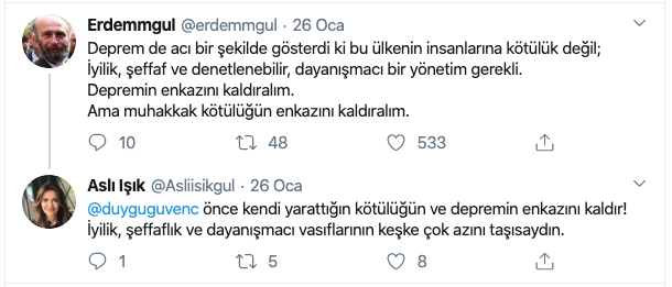 Aslı Gül, eşi Erdem Gül'ün bu paylaşımını alıntılayarak zehir zemberek suçlamalar yaptı. Aslı Gül, gazeteci Duygu Güvenç'i de etkileyerek, Erdem Gül'e, "Önce kendi yarattığın kötülüğün ve depremin enkazını kaldır! İyilik, şeffaflık ve dayanışmacı vasıflarının keşke çok azını taşısaydın." cevabı verdi.