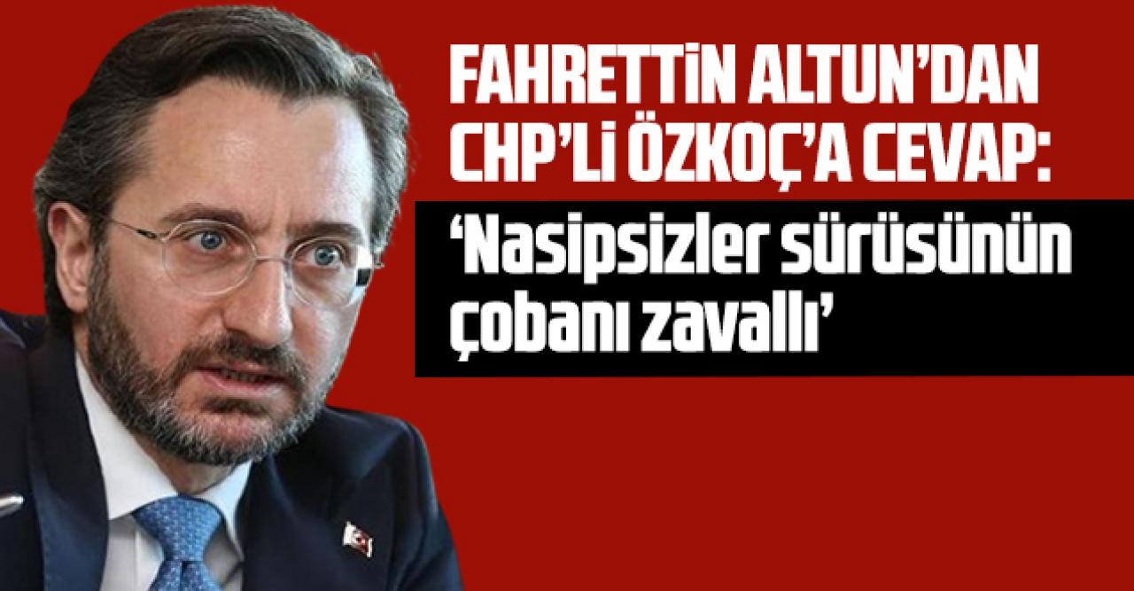 Fahrettin Altun Twitter hesabından yaptığı paylaşımla CHP'li Özkoç'a tepki gösterdi. Altun paylaşımında, "Sesi kulakları tırmalayan hadsiz, Cumhurbaşkanımız sayın Recep Tayyip Erdoğan’a ve sayın Devlet Bahçeli’ye ahlaksız bir şekilde hakaret ederek yine milletimize olan kinini kusmuş. Nasipsizler sürüsünün çobanı bu zavallı hakettiği cevabı hem hukuk önünde hem de sandıkta alacaktır" dedi.