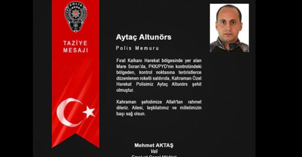 "Fırat Kalkanı harekat bölgesinde yer alan Mare Soran'da, PKK/PYD'nin kontrolündeki bölgeden, kontrol noktasına teröristlerce düzenlenen roketli saldırıda, kahraman özel harekat polisimiz Aytaç Altunörs şehit olmuştur. Kahraman şehidimize Allah'tan rahmet dileriz. Ailesi, teşkilatımız ve milletimizin başı sağ olsun."