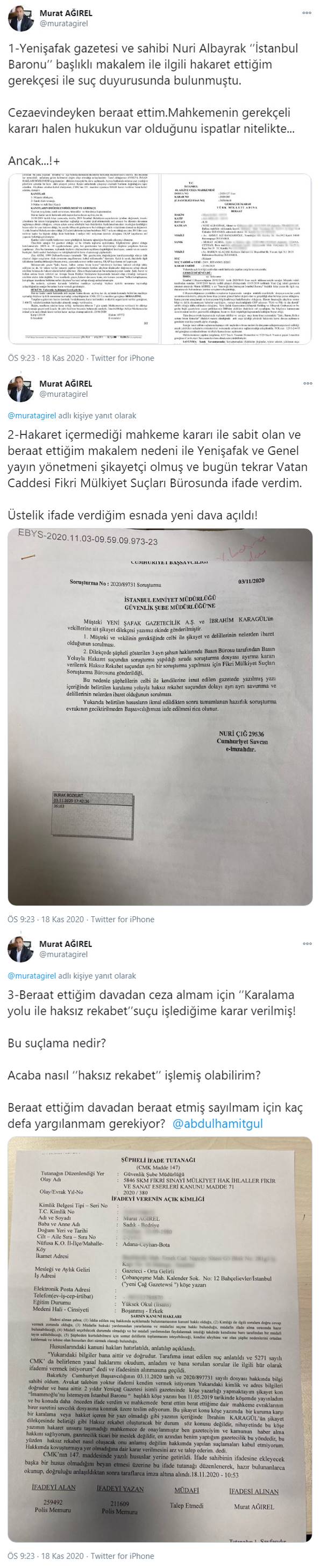 Yeniçağ gazetesi yazarı Murat Ağırel, cezaevinde olduğu sırada Albayrak Grubu Yönetim Kurulu üyesi Nuri Albayrak'ın hakaret gerekçesi ile açtığı davadan beraat ettiğini ancak aynı suçla yeniden hakkında dava açıldığını duyurdu.