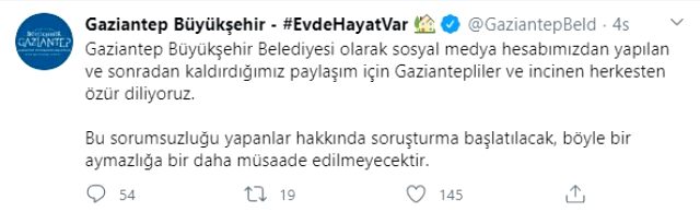 Belediyenin açıklamasında "Gaziantep Büyükşehir Belediyesi olarak sosyal medya hesabımızdan yapılan ve sonradan kaldırdığımız paylaşım için Gaziantepliler ve incinen herkesten özür diliyoruz. Bu sorumsuzluğu yapanlar hakkında soruşturma başlatılacak, böyle bir aymazlığa bir daha müsaade edilmeyecektir" dendi.