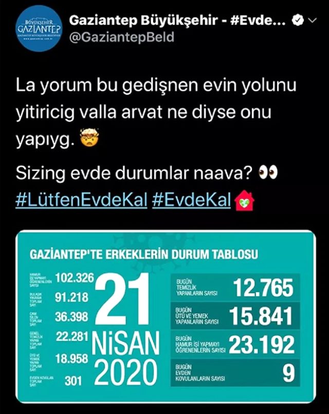 Sağlık Bakanlığı'nın her gün koronavirüste son durumu açıklamak için kullandığı tabloya benzer tabloda, 'evde kal' çağrıları sonrası erkeklerin ev işleriyle meşgul olduğu ifade ediliyordu.