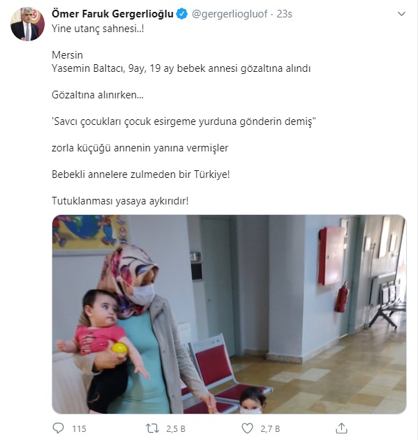 Gergerlioğlu, Twitter hesabından yaptığı açıklamada “Yine utanç sahnesi! Mersin...Yasemin Baltacı, 9 ay, 19 ay bebek annesi gözaltına alındı. Gözaltına alınırken 'Savcı çocukları çocuk esirgeme yurduna gönderin’ demiş. Zorla küçüğü annenin yanına vermişler. Bebekli annelere zulmeden bir Türkiye! Tutuklanması yasaya aykırıdır” ifadelerini kullandı.