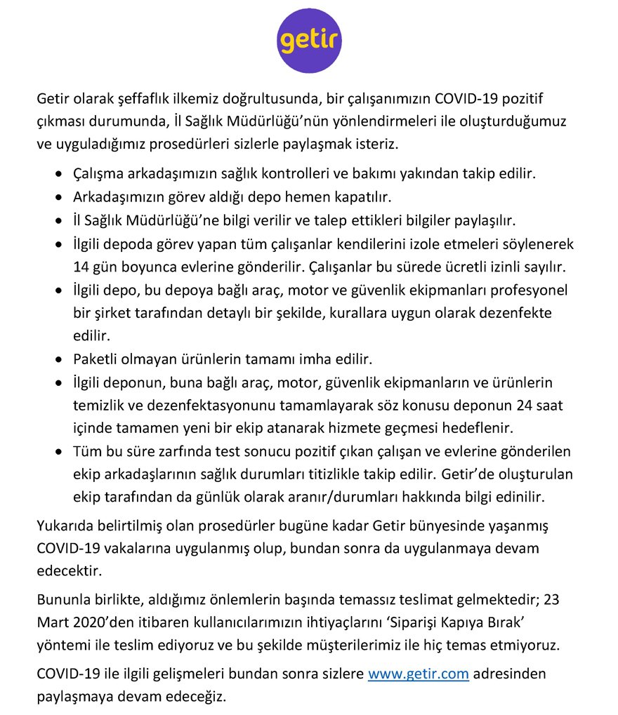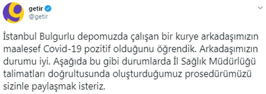 "İstanbul Bulgurlu depomuzda çalışan bir kurye arkadaşımızın maalesef Covid-19 pozitif olduğunu öğrendik. Arkadaşımızın durumu iyi. Aşağıda bu gibi durumlarda İl Sağlık Müdürlüğü talimatları doğrultusunda oluşturduğumuz prosedürümüzü sizinle paylaşmak isteriz."