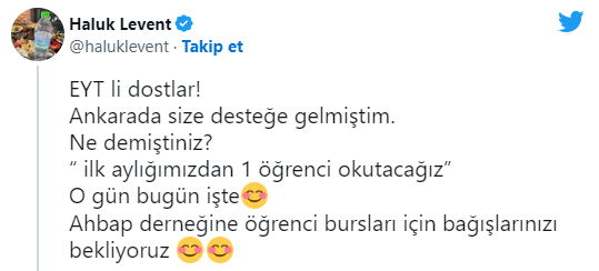 Haluk Levent Twitter hesabından yaptığı paylaşımda "EYT'li dostlar! Ankara'da size desteğe gelmiştim. Ne demiştiniz? 'İlk aylığımızdan 1 öğrenci okutacağız' O gün bugün işte. Ahbap Derneği'ne öğrenci bursları için bağışlarınızı bekliyoruz" ifadelerini kullandı.