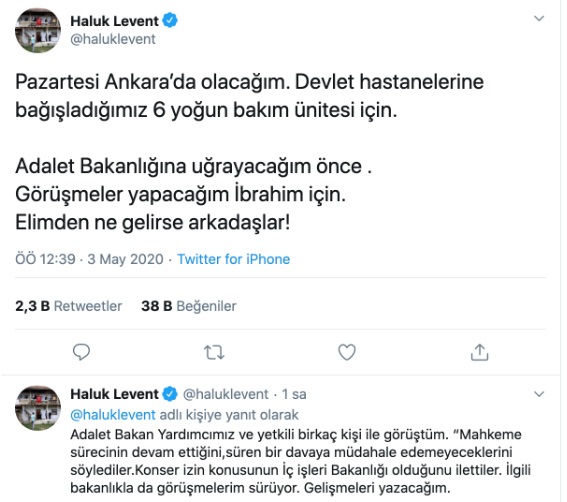Haluk Levent sosyal medya hesabından yaptığı açıklamada, "Adalet Bakan Yardımcımız ve yetkili birkaç kişi ile görüştüm. Mahkeme sürecinin devam ettiğini, süren bir davaya müdahale edemeyeceklerini söylediler. Konser izin konusunun İçişleri Bakanlığı olduğunu ilettiler. İlgili bakanlıkla da görüşmelerim sürüyor. Gelişmeleri yazacağım"dedi.