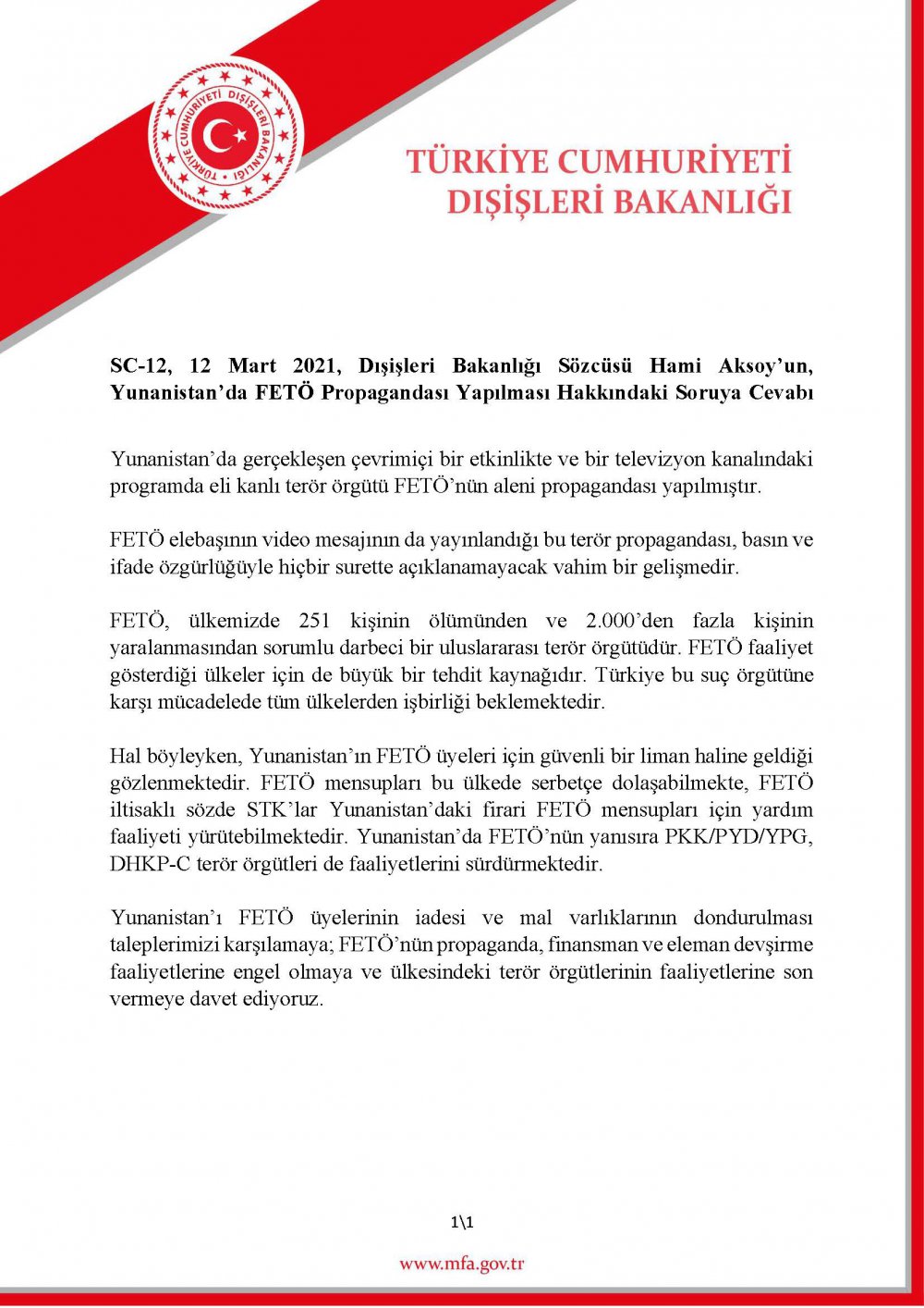 Dışişleri Bakanlığı Sözcüsü Hami Aksoy, Yunanistan'daki bir televizyon programında terör örgütü FETÖ'nün propagandasının yapılması üzerine yazılı bir açıklama yayımlayarak tepki gösterdi.