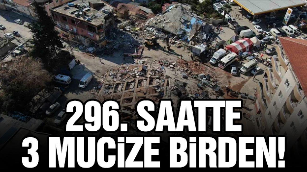 Arama kurtarma çalışmalarının devam ettiği Hatay'da depremin 296'ncı saatinde 3 kişi enkazdan çıkarıldı.