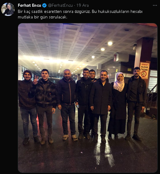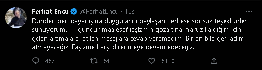 Twitter hesabından açıklamalarda bulunan Encü, "Bir kaç saatlik esaretten sonra özgürüz. Bu hukuksuzlukların hesabı mutlaka bir gün sorulacak.Dünden beri dayanışma duygularını paylaşan herkese sonsuz teşekkürler sunuyorum. İki gündür maalesef faşizmin gözaltına maruz kaldığım için gelen aramalara, atılan mesajlara cevap veremedim. Bir an bile geri adım atmayacağız. Faşizme karşı direnmeye devam edeceğiz" dedi.