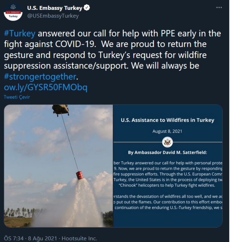 ABD Türkiye Büyükelçiliği yaptığı paylaşımda, “Türkiye, COVID-19’la mücadelenin başında yardım talebimize KKE ile yanıt vermişti. Bu jeste karşılık olarak Türkiye’nin orman yangınlarını bastırma konusundaki yardım/destek talebine yanıt vermekten gurur duyuyoruz” ifadelerini kullandı. Bu yardım kapsamında Chinook modeli ABD yapımı askeri helikopterlerin gönderileceği duyuruldu.