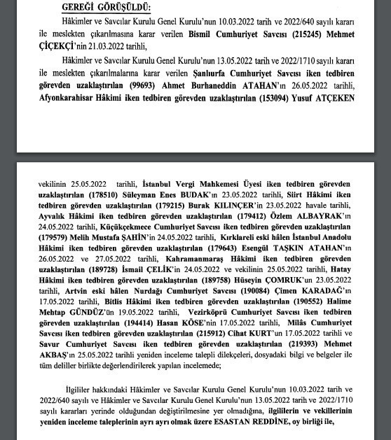 Afyonkarahisar Hakimi Yusuf Atçeken, Savur Cumhuriyet Savcısı Mehmet Akbaş, İstanbul Anadolu Hakimi Esengül Taşkın Atahan, Bitlis Hakimi Halime Mehtap Gündüz, İstanbul Vergi Mahkemesi Üyesi Süleyman Enes Budak, Küçükçekmece Cumhuriyet Savcısı Melih Mustafa Şahin, Şanlıurfa Cumhuriyet Savcısı Ahmet Burhaneddin Atahan, Ayvalık Hakimi Özlem Albayrak, Hatay Hakimi Hüseyin Çomruk, Nurdağı Cumhuriyet Savcısı Çimen Karadağ, Vezirköprü Cumhuriyet Savcısı Hasan Köse, Milas Cumhuriyet Savcısı Cihat Kurt, Siirt Hakimi Burak Kılınçer, Eskişehir Cumhuriyet Savcısı Faruk Karahan, Kahramanmaraş Hakimi İsmail Çelik.
