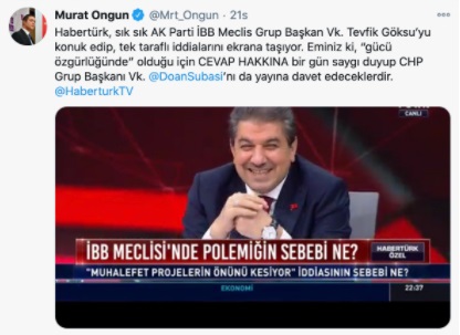 İBB Sözcüsü Ongun, Twitter'dan HaberTürk'e "tek taraflılık" tepkisi gösterdi. HaberTürk'ün, "gücü özgürlüğünde" sloganını hatırlatan Ongun, "'Gücü özgürlüğünde' olduğu için cevap hakkında bir gün saygı duyup CHP Grup Başkanvekili Doğan Subaşı'nı da yayına davet edeceklerdir" ifadesini kullandı.