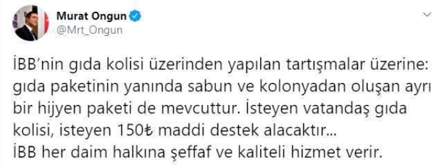 Gıda kolisi tartışmaları sonrası İBB Sözcüsü Murat Ongun'dan da bir açıklama geldi. "İBB'nin gıda kolisi üzerinden yapılan tartışmalar üzerine" diyerek sosyal medya üzerinden açıklamada bulunan Ongun, "Gıda paketinin yanında sabun ve kolonyadan oluşan ayrı bir hijyen paketi de mevcuttur. İsteyen vatandaş gıda kolisi, isteyen 150 TL maddi destek alacaktır. İBB her daim halkına şeffaf ve kaliteli hizmet verir" dedi.