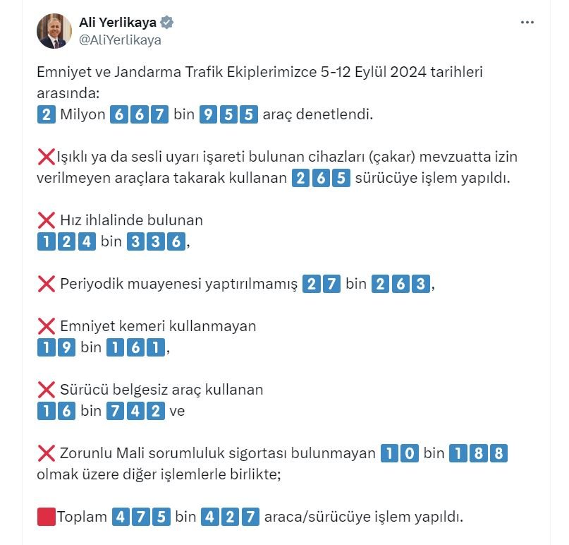 Bakan Yerlikaya, sosyal medya hesabından yaptığı açıklamada, "Emniyet ve jandarma trafik ekiplerimizce 5-12 Eylül 2024 tarihleri arasında 2 milyon 667 bin 955 araç denetlendi. Işıklı ya da sesli uyarı işareti bulunan cihazları (çakar) mevzuatta izin verilmeyen araçlara takarak kullanan 265 sürücüye işlem yapıldı. Hız ihlalinde bulunan 124 bin 336, periyodik muayenesi yaptırılmamış 27 bin 263, emniyet kemeri kullanmayan 19 bin 161, sürücü belgesiz araç kullanan 16 bin 742 ve zorunlu mali sorumluluk sigortası bulunmayan 10 bin 188 olmak üzere diğer işlemlerle birlikte; toplam 475 bin 427 araca/sürücüye işlem yapıldı" dedi.