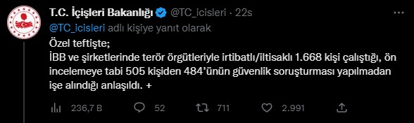 Özel teftişte;İBB ve şirketlerinde terör örgütleriyle irtibatlı/iltisaklı 1.668 kişi çalıştığı, ön incelemeye tabi 505 kişiden 484’ünün güvenlik soruşturması yapılmadan işe alındığı anlaşıldı.
