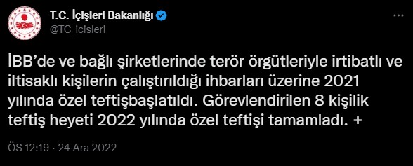 İBB’de ve bağlı şirketlerinde terör örgütleriyle irtibatlı ve iltisaklı kişilerin çalıştırıldığı ihbarları üzerine 2021 yılında özel teftişbaşlatıldı. Görevlendirilen 8 kişilik teftiş heyeti 2022 yılında özel teftişi tamamladı.