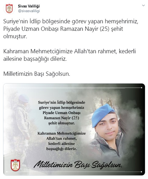 "Suriye’nin İdlip bölgesinde görev yapan hemşehrimiz, Piyade Uzman Onbaşı Ramazan Nayir (25) şehit olmuştur. Kahraman Mehmetciğimize Allah'tan rahmet, kederli ailesine başsağlığı dileriz. Milletimizin Başı Sağolsun."