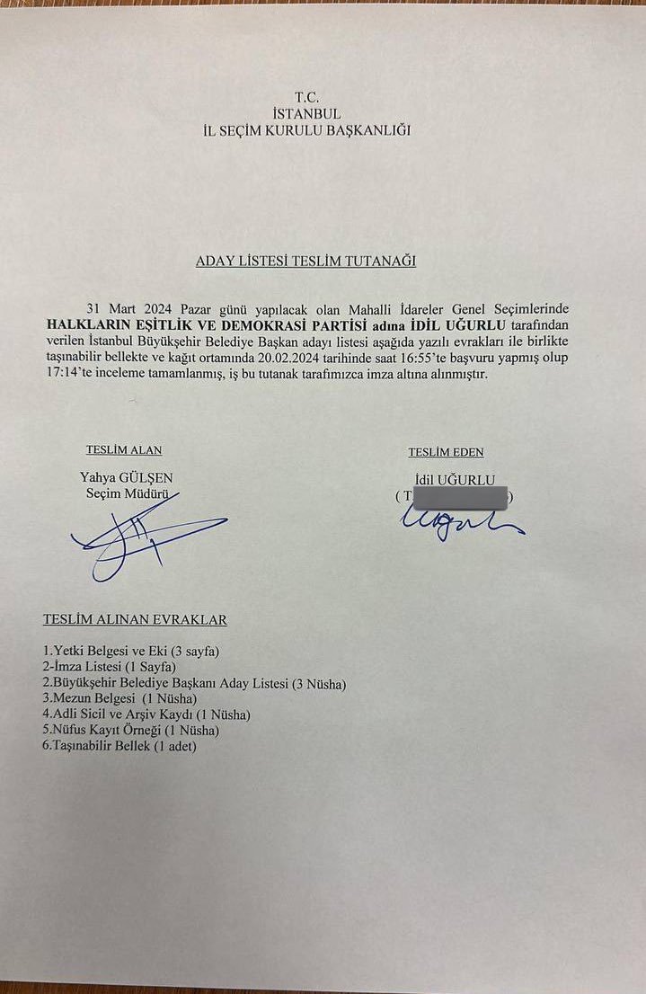 DEM Parti sosyal medya hesabı üzerinden İstanbul Büyükşehir Belediye Başkan adaylarının başvurusunu yaptıkları evrakı paylaştı. İl Seçim Kurulu Başkanlığı başlıklı evrakta, "Aday Listesi Teslim Tutanağı, 31 Mart 2024 Pazar günü yapılacak olan Mahalli İdareler Genel Seçimlerinde Halkların Eşitlik Ve Demokrasi Partisi adına İdil Uğurlu tarafından verilen İstanbul Büyükşehir Belediye Başkan adayı listesi aşağıda yazılı evrakları ile birlikte taşınabilir bellekte ve kağıt ortamında 20.02.2024 tarihinde saat 16.55'te başvuru yapmış olup 17.14'te inceleme tamamlanmış, iş bu tutanak tarafımızca imza altına alınmıştır" yazdığı görüldü.