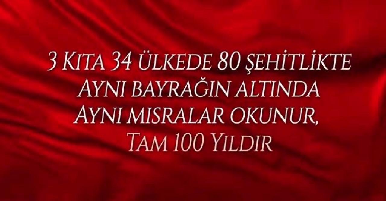 "Tam 100 yıldır 3 kıta 34 ülkede 80 şehitlikte aynı bayrağın altında aynı mısralar okunur. Bu mısralar bağımsızlığımızın tüm dünyaya ilanıdır. Baştan sona her bir satırda aziz milletimizin hikayesini anlatır Mehmet Akif. Ve biz Akif’in mısralarıyla haykırırız özgürlüğümüzü."