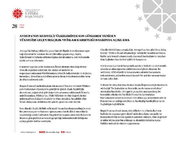 İletişim Başkanlığı'ndan yapılan yazılı açıklamada, Avrupa'da birkaç yıldan bu yana ırkçı, faşist, müslüman ve yabancı düşmanlığına dayalı anlayışın, son haftalarda adeta zirveye çıktığı ifade edildi. Camilere yapılan polis baskınları, İslam dininin tüm değerlerine yönelik organize saldırılar, üst düzey siyasilerin ve organizasyonlarının Müslümanlara yönelik hakaretamiz ve dışlayıcı tutumlarının, tüm dünya Müslümanlarını hem derinden üzdüğü hem de öfkelendirdiği belirtilerek, şu ifadeler kullanıldı:
