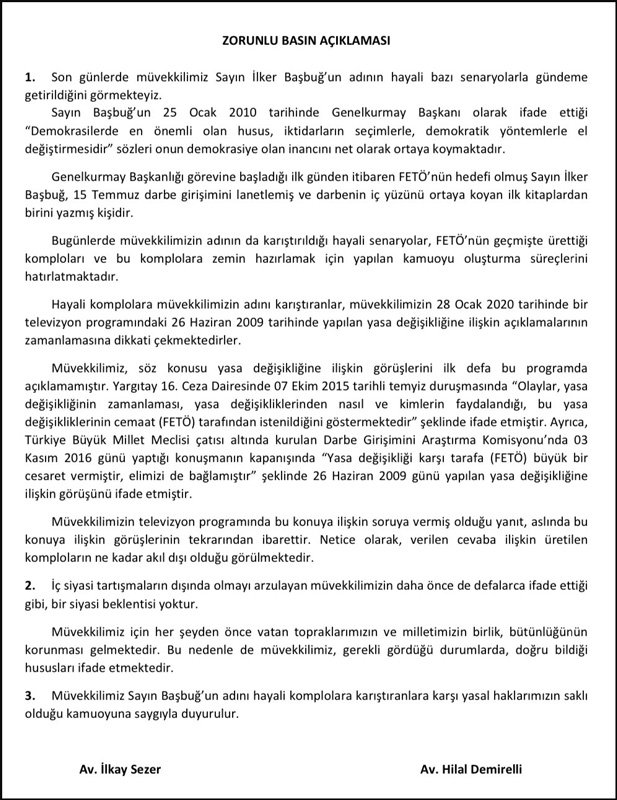 1. Son günlerde müvekkilimiz Sayın İlker Başbuğ’un adının hayali bazı senaryolarla gündeme getirildiğini görmekteyiz.