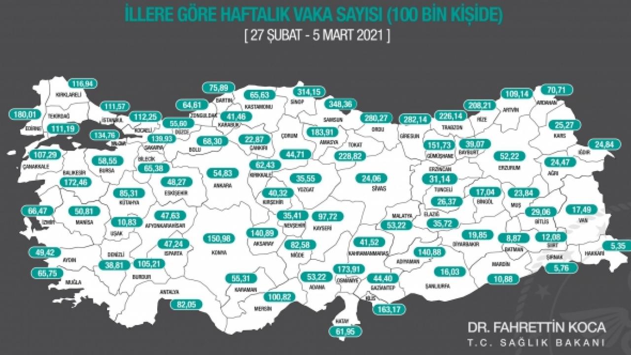 Sağlık Bakanı Fahrettin Koca, Twitter hesabından il il 100 bin kişide görülen koronavirüs vaka sayılarının yer aldığı güncel haritayı paylaştı. Bakan Koca'nın, "Yüksek riskli illerimiz risklerini düşürmek için daha tedbirli olmalı. Normalleşme kontrollü gerçekleşmeli" mesajıyla paylaştığı haritada, 27 Şubat-5 Mart tarihleri arasındaki veriler yer aldı.