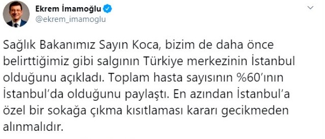 İmamoğlu, şu ifadeleri kullandı: "Sağlık Bakanımız Sayın Koca, bizim de daha önce belirttiğimiz gibi salgının Türkiye merkezinin İstanbul olduğunu açıkladı. Toplam hasta sayısının %60'ının İstanbul'da olduğunu paylaştı. En azından İstanbul'a özel bir sokağa çıkma kısıtlaması kararı gecikmeden alınmalıdır."