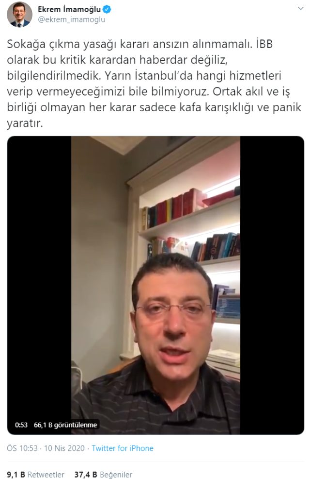 İmamoğlu'nun Twitter'dan paylaştığı mesaj şöyle: "Sokağa çıkma yasağı kararı ansızın alınmamalı. İBB olarak bu kritik karardan haberdar değiliz, bilgilendirilmedik. Yarın İstanbul'da hangi hizmetleri verip vermeyeceğimizi bile bilmiyoruz. Ortak akıl ve iş birliği olmayan her karar sadece kafa karışıklığı ve panik yaratır."