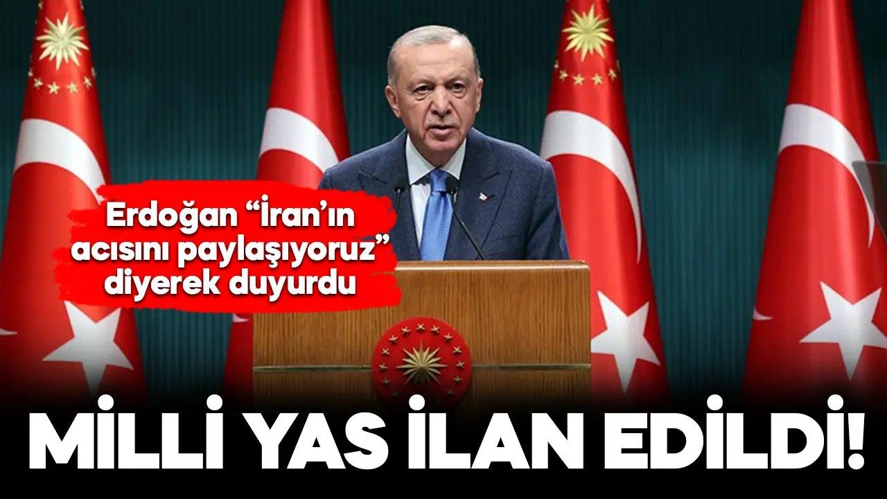 Cumhurbaşkanı Erdoğan, "Kabine toplantımızda, İran halkının yaşadığı derin acıyı paylaşmak üzere ülkemizde bir günlük milli yas ilan edilmesini kararlaştırdık." dedi.